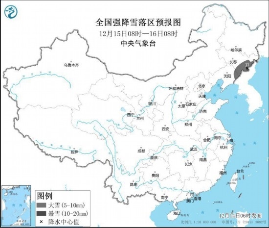 12月15日08時至12月16日08時,吉林東部、遼寧東北部等地部分地區(qū)有大雪,其中,吉林東部長白山地區(qū)局地有暴雪(10~11毫米)。上述部分地區(qū)新增積雪深度3~8厘米,局地可達10厘米以上。