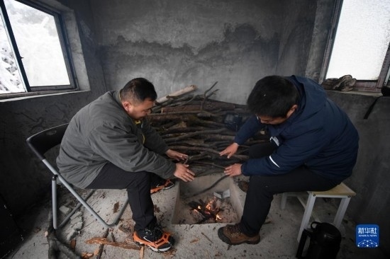 12月19日,尹斌(右)和龍昱君在110千伏西公線003號監(jiān)測哨所休息。這座水泥小屋在2020年修建,以便輸電運檢工觀測融冰時休息。