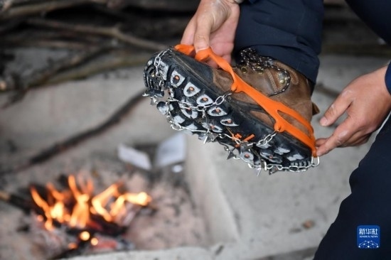 12月19日,尹斌在110千伏西公線003號監(jiān)測哨所休息后穿上冰爪。