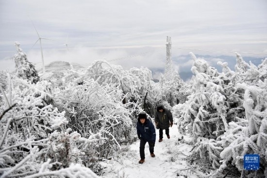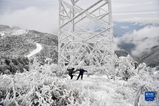 12月19日,尹斌(右)和龍昱君在110千伏西公線003號監(jiān)測哨所觀測鐵塔覆冰情況后返回。
