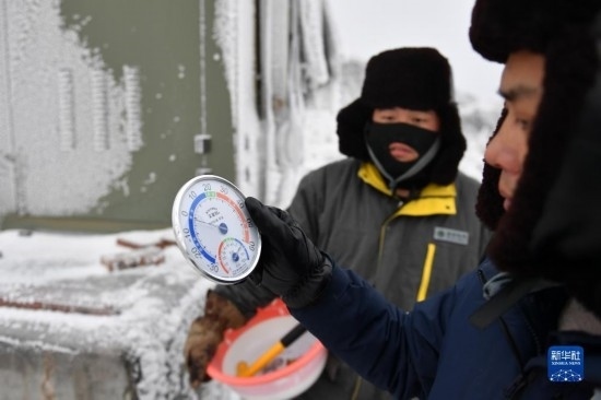 12月19日,尹斌(右)和龍昱君前往110千伏西公線003號監(jiān)測哨所觀測冰情。