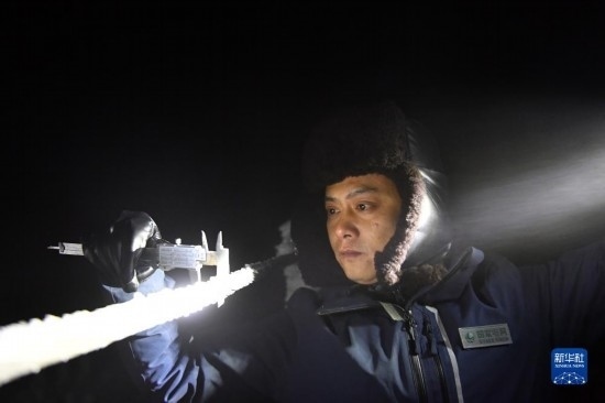 12月18日夜間,尹斌在110千伏西公線001號監(jiān)視哨所用游標卡尺測量導線覆冰厚度。