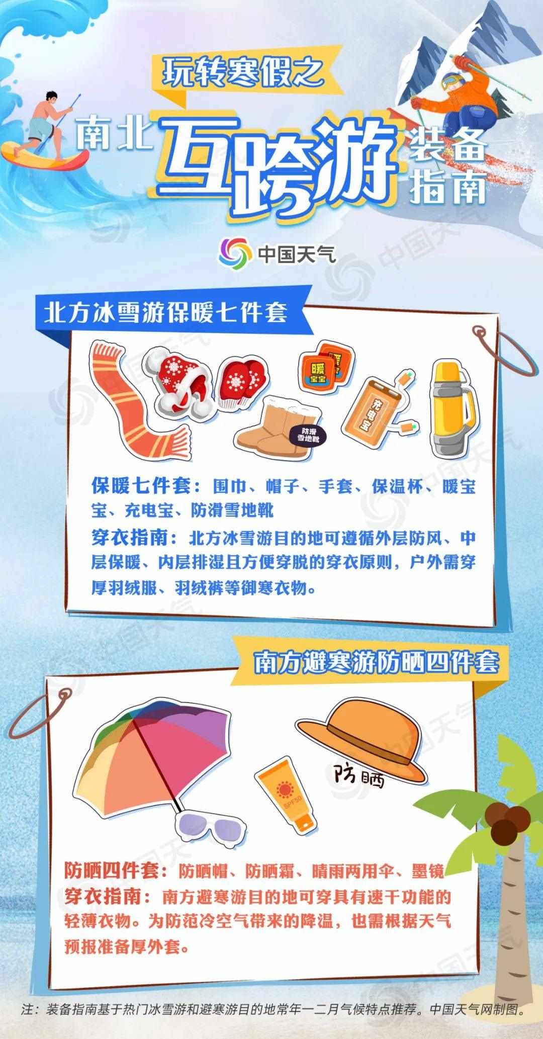 無論是北上戲冰雪,還是南下避寒游,裝備是否齊全直接關(guān)系到旅游行程的質(zhì)量。對(duì)于前往北方冰雪游的朋友來說,防寒保暖至關(guān)重要;南下避寒則要注意防曬防蚊。
