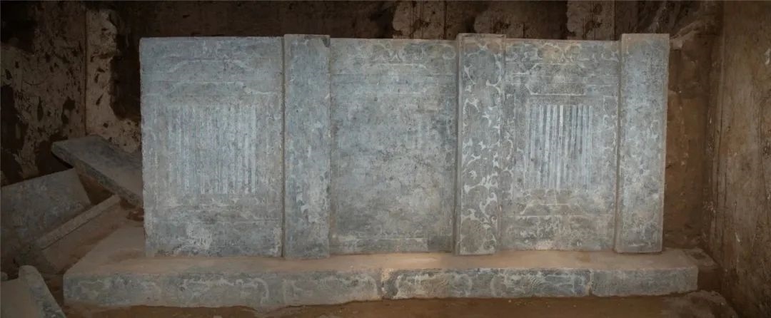 墓室西側(cè)發(fā)現(xiàn)石槨一具,保存較好。石槨面闊三間,進(jìn)深兩間,頂部為廡殿式,僅一側(cè)雕刻有瓦棱;槨身由壁板和倚柱卯和而成,板壁外側(cè)雕刻門窗、卷云及神獸,內(nèi)側(cè)主體為侍女,周邊飾有花草等內(nèi)容;倚柱內(nèi)外均刻纏枝卷草花朵,部分穿插飛禽走獸;基座以七塊石板鋪成,立面間隔刻有壸門圖案,內(nèi)填奔獸圖樣。石槨線刻精細(xì),畫面華麗而不繁縟,人物體態(tài)豐腴而不臃腫,充分體現(xiàn)出盛唐開元時期圖案靈動、富于想象的特征。