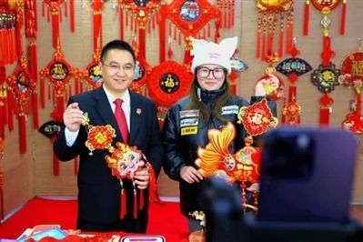 紅花法庭庭長栗瑞(左)在中國結電商直播間客串主播,既“帶貨”又普法。