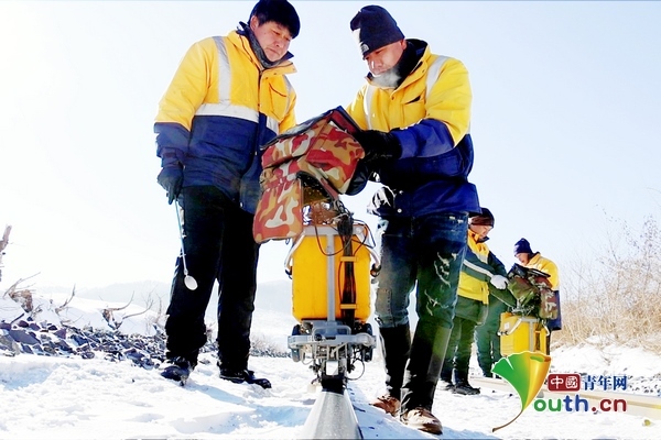 兩臺超聲波鋼軌探傷儀,在身穿橙黃色工作服的探傷工的推行下,緩緩向線路遠方走去。寒風中,探傷工們從頭到腳的防寒裝備也為他們在冬季室外作業(yè)提供了保障。