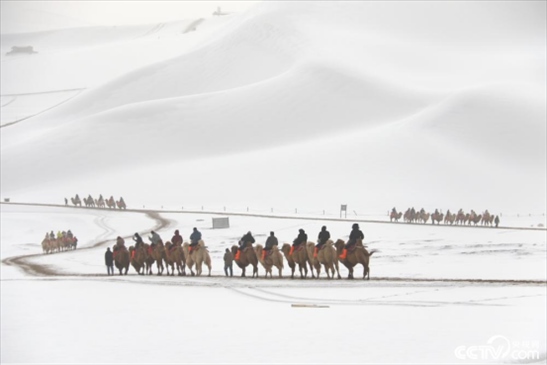 2024年2月18日,甘肅酒泉,游客在敦煌市鳴沙山月牙泉景區(qū)游覽。雪后的甘肅省敦煌市鳴沙山月牙泉景區(qū)銀裝素裹,景色如畫,游客徜徉其中,欣賞大漠雪景,體驗絲路風情。