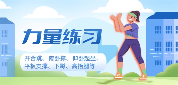 開合跳主要鍛煉下肢和腰腹肌肉力量,主要動作是雙腳往外張開約1.5倍肩寬,雙手往頭頂方向擊掌,手肘盡量伸直,在頭部兩側(cè)夾緊,身體向上延伸。