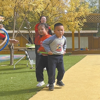 孩子們?cè)陔p青第四幼兒園操場(chǎng)上做游戲。盛康園社區(qū)供圖