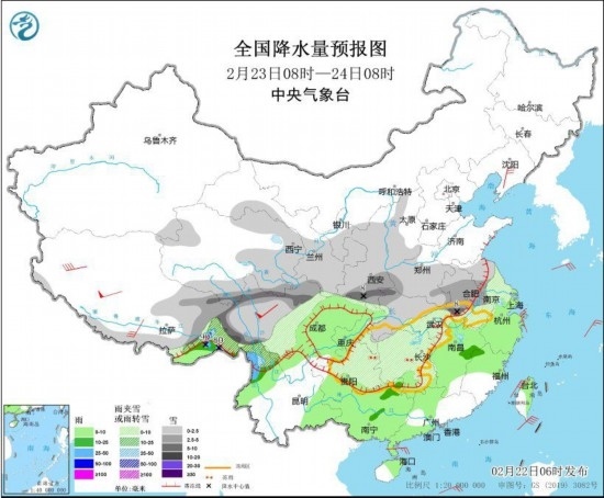 全國降水量預(yù)報(bào)圖(2月22日8時(shí)-23日8時(shí))