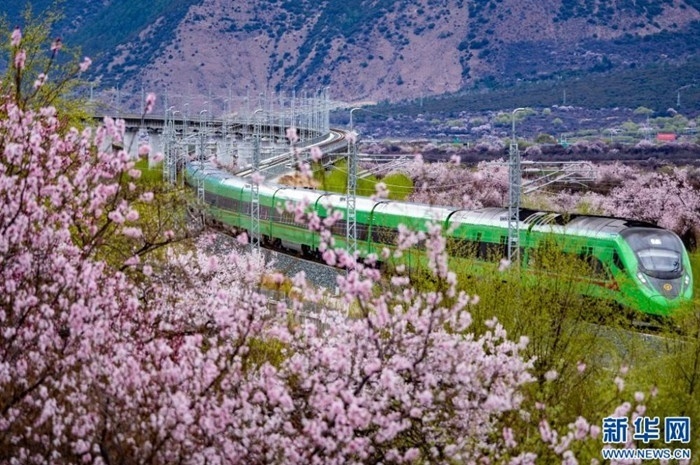 雪域高原桃花開,復(fù)興號(hào)上賞春光。拉林鐵路的車票,猶如一張賞花請(qǐng)柬,吸引了眾多游客前來(lái)雪域高原賞桃花。