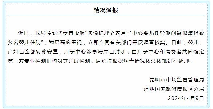 央視網(wǎng)消息:據(jù)“滇池度假發(fā)布”官微消息,昆明市市場監(jiān)督管理局滇池國家旅游度假區(qū)分局通報,近日,該局接到消費者投訴“博悅護理之家月子中心嬰兒托管期間疑似裝修致多名嬰兒住院”,該局高度重視,立即會同有關(guān)部門開展調(diào)查核實。目前,嬰兒、產(chǎn)婦已全部轉(zhuǎn)移安置,月子中心涉事房屋已封閉,由月子中心和消費者共同確定第三方專業(yè)檢測機構(gòu)對其開展檢測,后續(xù)將根據(jù)調(diào)查情況依法依規(guī)進行處理。