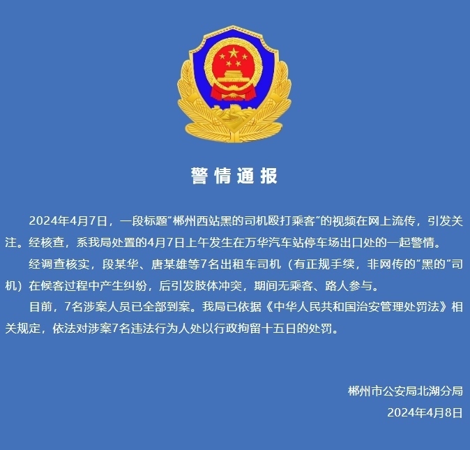 央視網(wǎng)消息:據(jù)“北湖公安局”公眾號(hào)消息,4月7日,一段標(biāo)題“郴州西站黑的司機(jī)毆打乘客”的視頻在網(wǎng)上流傳,引發(fā)關(guān)注。經(jīng)核查,系該局處置的4月7日上午發(fā)生在萬華汽車站停車場(chǎng)出口處的一起警情。