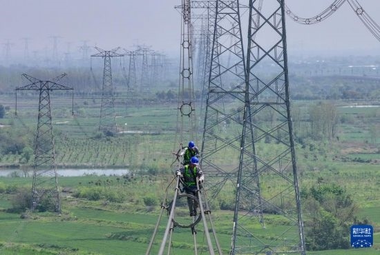 4月9日,在位于安徽省合肥市廬江縣郭河鎮(zhèn)的直流±800千伏建蘇線3418號桿塔處,國網合肥供電公司工人進行高空檢修作業(yè)(無人機照片)。