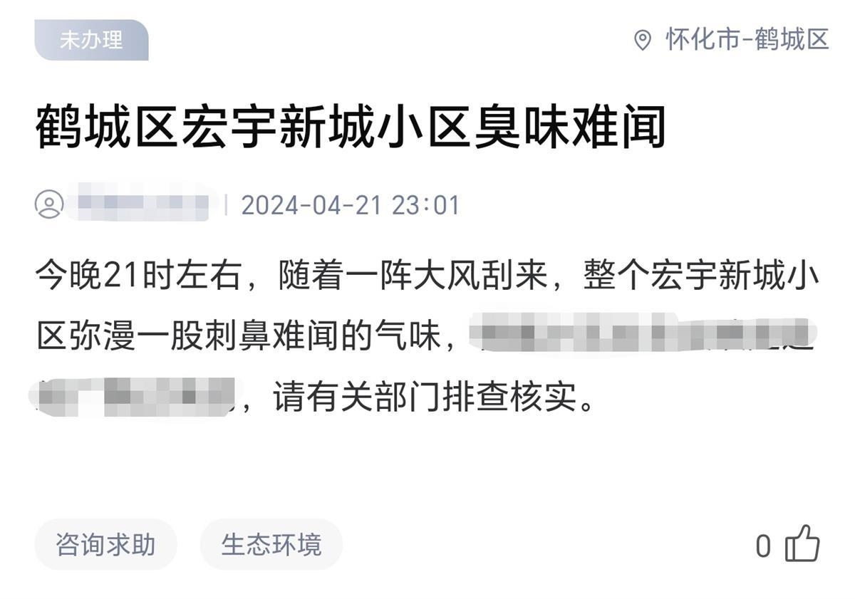 4月21日晚,湖南懷化市鶴城區(qū)多位居民反映聞到不明異味,有人稱像煤氣泄漏,味道刺鼻,有人稱臭味難聞。4月23日,懷化市生態(tài)環(huán)境局工作人員告訴極目新聞?dòng)浾?,已接到較多投訴,正在調(diào)查中。