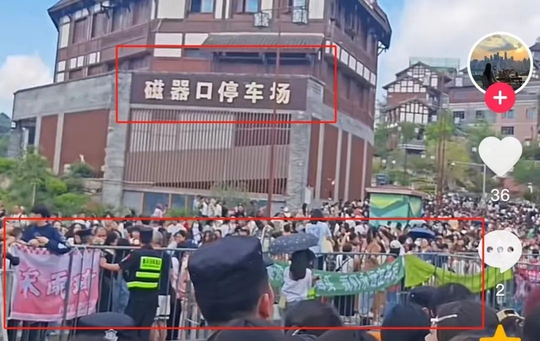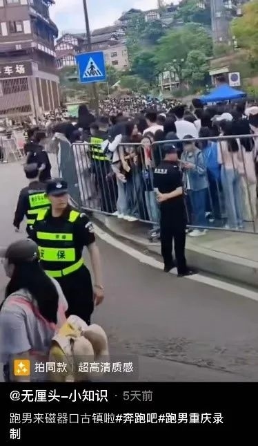 根據(jù)視頻顯示的“磁器口停車場”檢索視頻平臺(tái)相關(guān)內(nèi)容,有不少網(wǎng)友在4月19日發(fā)布了綜藝節(jié)目《奔跑吧》在當(dāng)?shù)劁浿茣r(shí)的畫面,通過比對可以發(fā)現(xiàn),網(wǎng)傳視頻中出現(xiàn)的圍欄、安保分布情況、以及圍欄上懸掛的不同顏色應(yīng)援橫幅等元素都與路人拍攝的清晰版視頻一致。