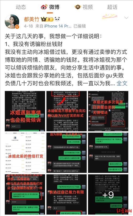 4月15日,都美竹粉絲朱姐發(fā)文稱,她先后給都美竹轉款近20萬元,現(xiàn)在認為都美竹“賣慘”騙錢。她希望都美竹還錢,但對方只給她轉了3萬元。