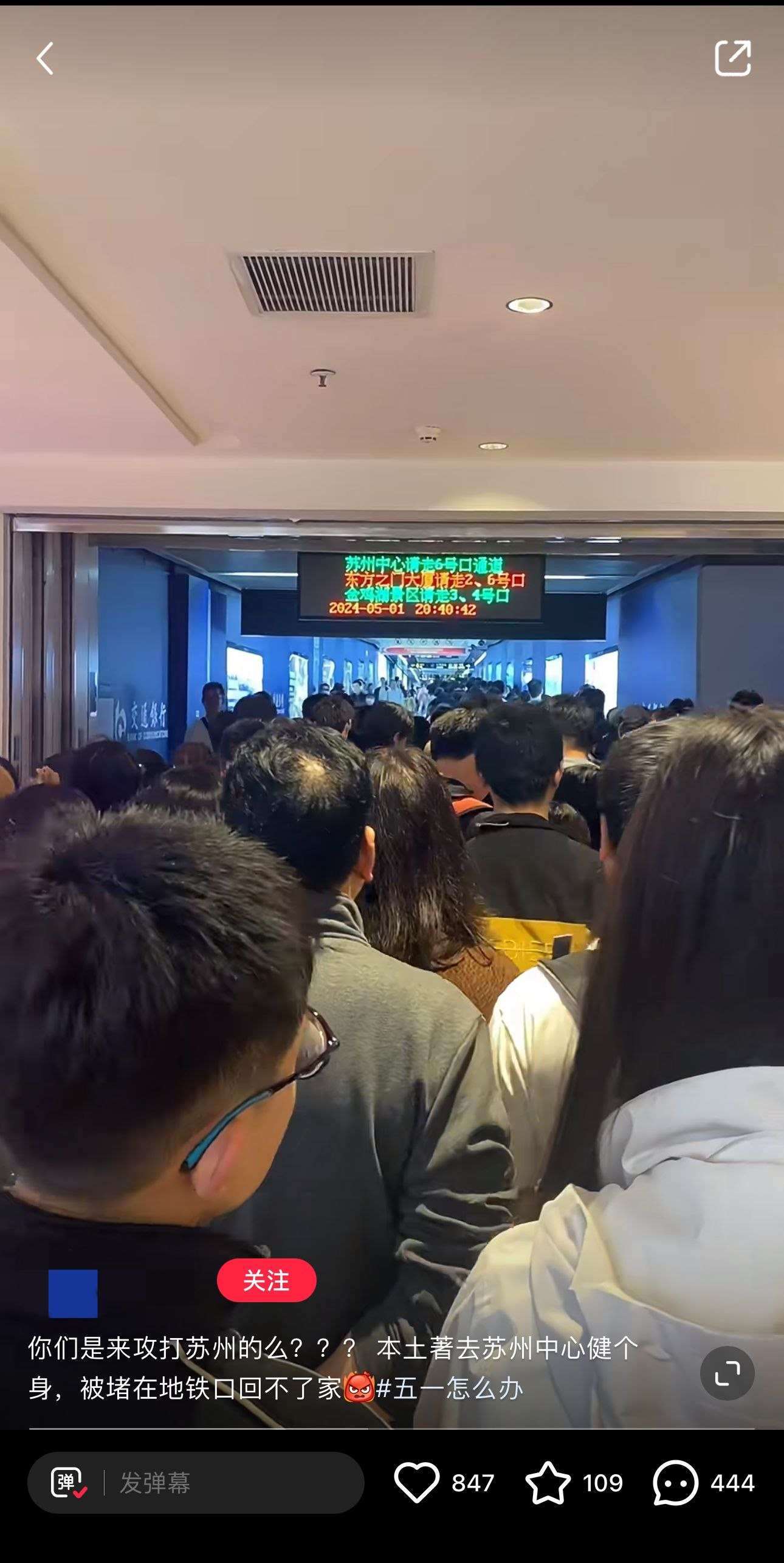 熱門(mén)旅游目的地的當(dāng)?shù)厥忻駝t“叫苦不迭”。有蘇州的網(wǎng)友發(fā)布視頻稱自己出門(mén)健身,被堵在地鐵口“回不了家”。