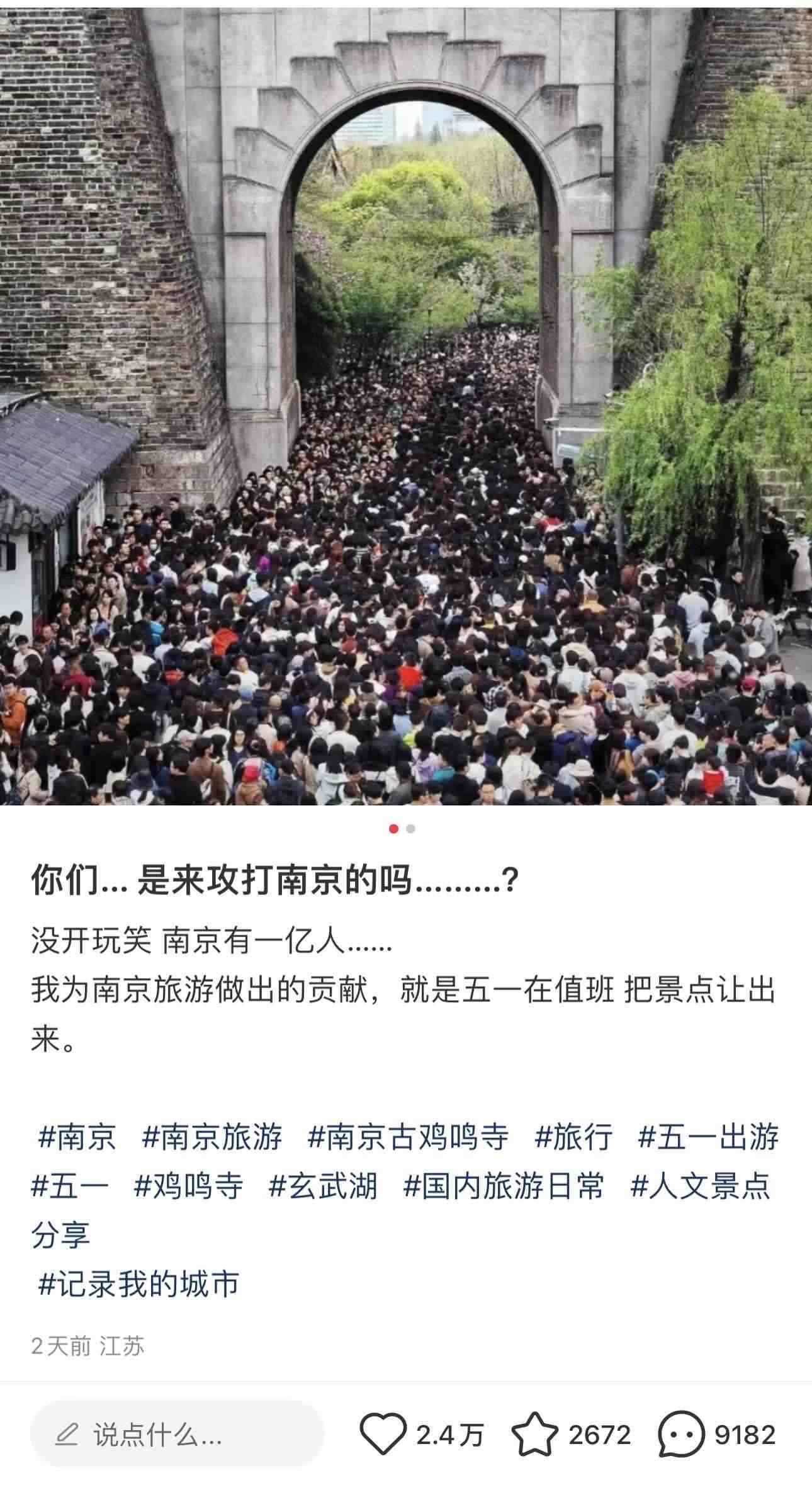 某定位顯示南京的網(wǎng)友表示:“我為南京旅游作出的貢獻(xiàn),就是五一在值班,把景點(diǎn)讓出來(lái)。”