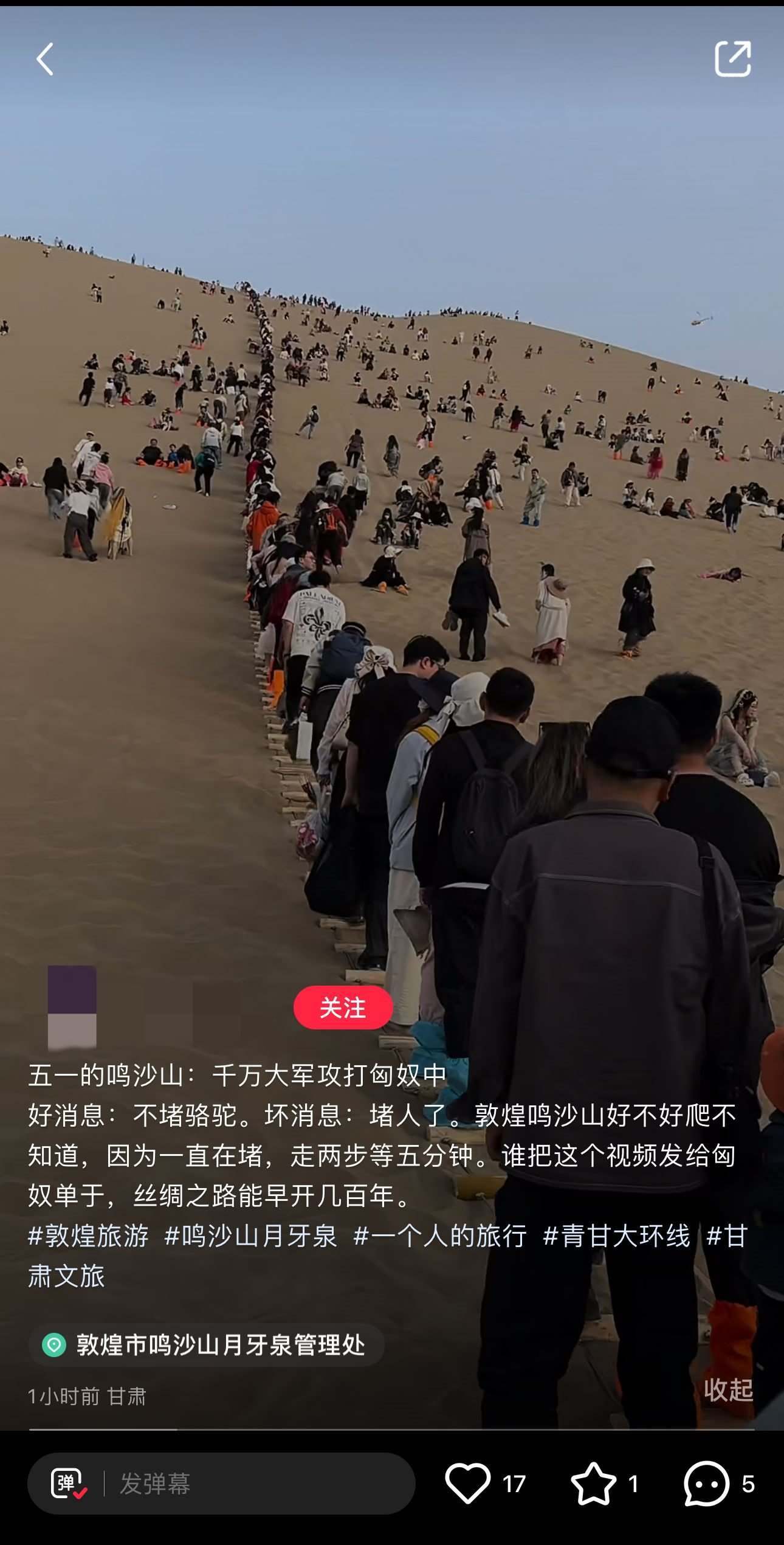 還有甘肅的網(wǎng)友在發(fā)布的關(guān)于敦煌鳴沙山的筆記中稱:“好消息:不堵駱駝。壞消息:堵人了……走兩步路等五分鐘?!?/p>