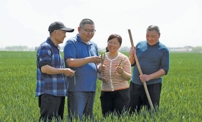 薛麗娜(右)和村民查看小麥長勢。陳 陽攝