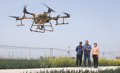 薛麗娜(右一)指導(dǎo)村民使用無人機(jī)噴灑農(nóng)藥。陳 陽攝