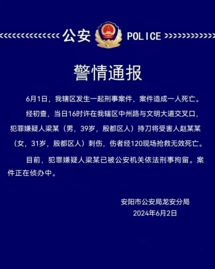 央視網(wǎng)消息:河南安陽市公安局龍安分局6月2日發(fā)布警情通報:6月1日,轄區(qū)發(fā)生一起刑事案件,案件造成一人死亡。經(jīng)初查,當(dāng)日16時許在轄區(qū)中州路與文明大道交叉口,犯罪嫌疑人梁某 (男,39歲,殷都區(qū)人)持刀將受害人趙某某(女,31歲,殷都區(qū)人)刺傷,傷者經(jīng)120現(xiàn)場搶救無效死亡。目前,犯罪嫌疑人梁某已被公安機關(guān)依法刑事拘留。案件正在偵辦中。