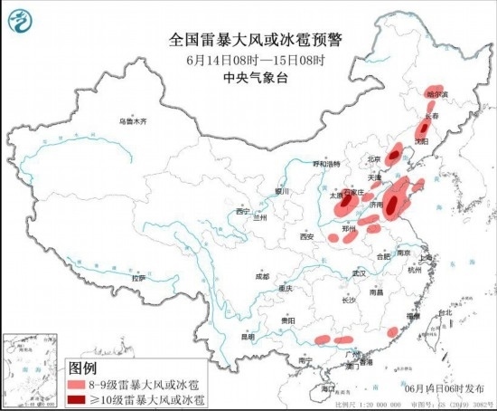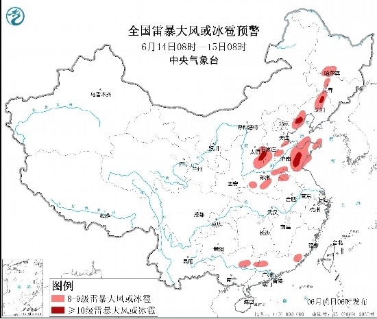 預計6月14日08時至15日08時,黑龍江南部、吉林中西部、遼寧西部和北部、山西東南部、河北南部和東北部、山東中東部和南部、河南中北部和東部、安徽北部、江蘇北部等地的部分地區(qū)將有8級以上雷暴大風或冰雹天氣,其中,遼寧北部和西部、山西東南部、河北南部和東北部、山東中南部等地的局地將有10級以上雷暴大風,最大風力可達11級以上;渤海部分海域、萊州灣、山東半島附近海域將有8~10級的雷暴大風。黑龍江南部和中東部、吉林南部和西北部、遼寧中東部和西南部、河北東北部、山東中東部和南部等地的部分地區(qū)將有小時雨量大于20毫米的短時強降水天氣,其中,黑龍江中部、山東中南部等地的局地小時雨量大于50毫米,最大可達80毫米以上。預計,強對流的主要影響時段為今天午后至夜間。中央氣象臺6月14日06時發(fā)布強對流天氣藍色預警(見圖2)。