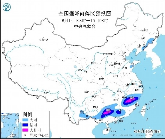 圖1 全國強降雨落區(qū)預報圖(6月14日08時-15日08時)