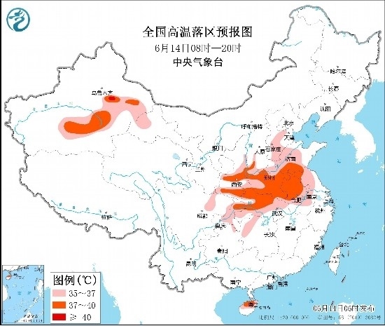 預計6月14日至15日,河北中南部、山西南部、陜西大部、黃淮、江淮、湖北北部以及內蒙古西部、新疆南疆盆地等地有高溫天氣,局地可達40℃以上。