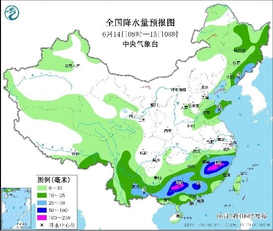 圖4 全國降水量預報圖(6月14日08時-15日08時)