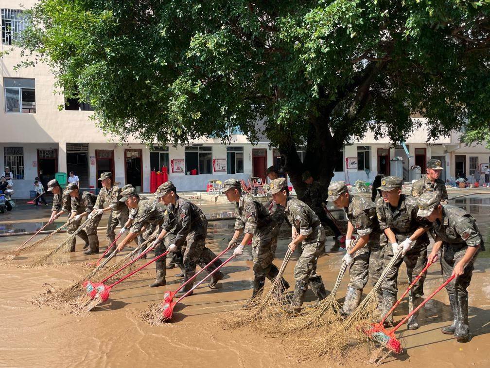 6月21日,武警廣西總隊(duì)桂林支隊(duì)的武警官兵正在幫助學(xué)校清淤。新華社記者李歡 攝