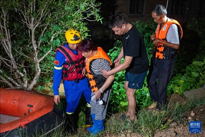 7月29日凌晨,在湖南省湘潭縣易俗河鎮(zhèn)四新堤附近,搶險(xiǎn)人員在轉(zhuǎn)移被困群眾。新華社記者 陳思汗 攝