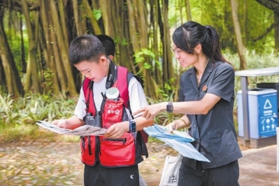 圖①:干警指引學(xué)生們觀察稀有鳥類。