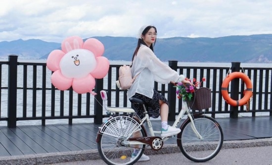 7月5日,越南游客在大理洱海邊騎行。新華社記者王賢思 攝