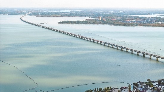 11月23日,蘇州吳江區(qū),滬蘇湖高鐵試運行列車跨過元蕩。 袁新宇 周悅磊 攝 (視覺江蘇網供圖)