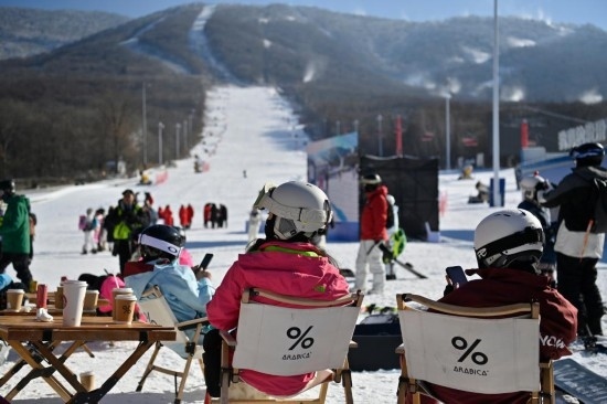 11月23日,滑雪愛好者在吉林市北大湖滑雪度假區(qū)的休息區(qū)喝咖啡。新華社記者 顏麟蘊(yùn) 攝