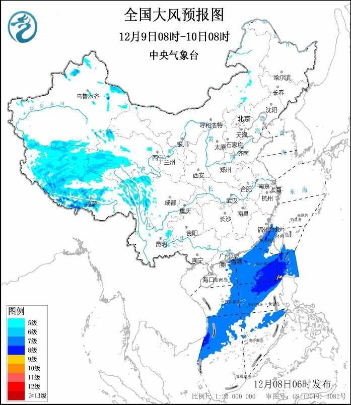 預(yù)計(jì),12月8日08時(shí)至9日08時(shí),西藏中西部、青海西南部、川西高原、新疆北部等地部分地區(qū)將有5~6級(jí)風(fēng),西藏中西部和青海西南部局地風(fēng)力可達(dá)7~8級(jí);東海大部、臺(tái)灣海峽、臺(tái)灣以東洋面、巴士海峽、南海北部、中部和西南部海域、北部灣將有7~8級(jí)、陣風(fēng)9級(jí)的大風(fēng),其中臺(tái)灣海峽部分海域的風(fēng)力可達(dá)9級(jí)、陣風(fēng)10級(jí)。