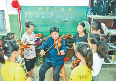 教學(xué)漸漸步入正軌后,張玉立還將支教的范圍擴(kuò)大到其他4個(gè)同樣偏僻的鄉(xiāng)鎮(zhèn)。山路崎嶇,往返山間,張玉立樂(lè)此不疲?!啊亚俾曀瓦M(jìn)大山’不僅能夠豐富孩子們的生活,還可以幫助他們走出大山。”張玉立說(shuō),經(jīng)過(guò)一段時(shí)間的教學(xué)以后,自己開(kāi)始有意識(shí)地挑選對(duì)小提琴有興趣、有天賦的孩子,成立小提琴班,利用課外時(shí)間進(jìn)行專(zhuān)門(mén)訓(xùn)練。