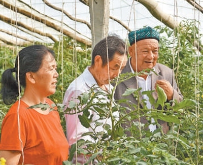 沙吾爾·芒力克(右一)和村民交流蔬菜種植經(jīng)驗(yàn)。