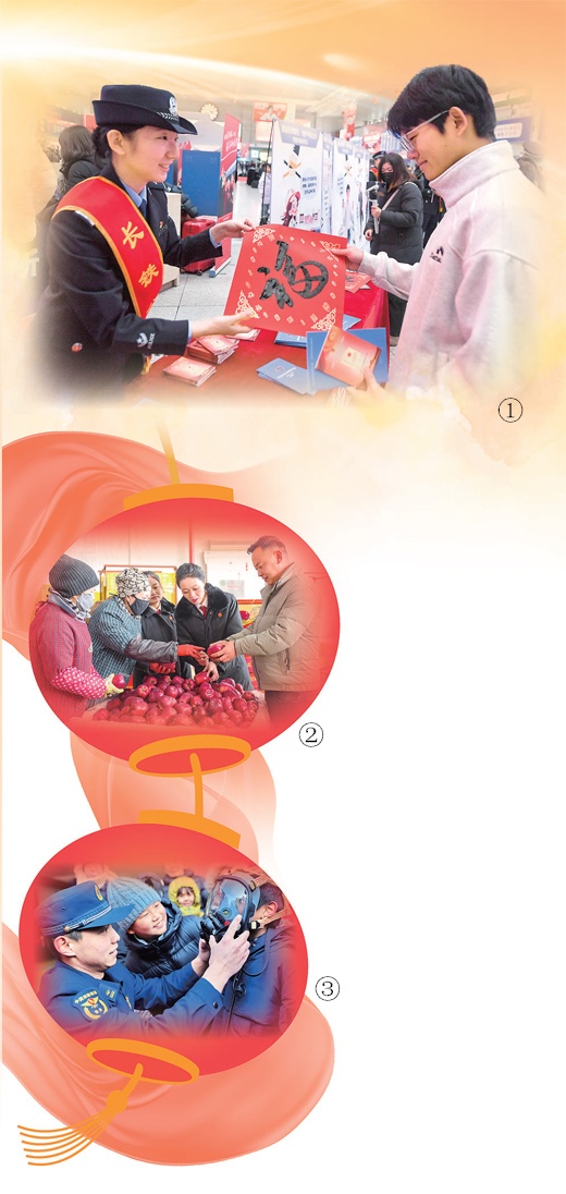 圖①:在吉林長(zhǎng)春,鐵路公安民警為旅客送“?!弊?。