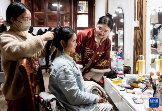 2月3日,在福州三坊七巷一處“三條簪”化妝跟拍點(diǎn),化妝師在為來(lái)自上海的母女進(jìn)行“三條簪”妝造。