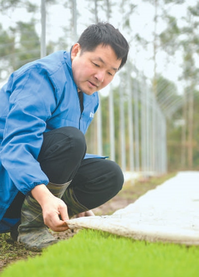 圖為陳超在育秧基地查看秧苗長(zhǎng)勢(shì)。