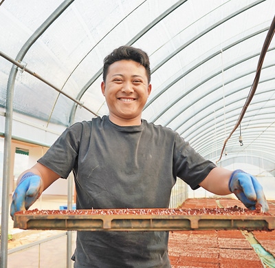 種好超級(jí)雜交水稻,秧苗質(zhì)量很重要。農(nóng)技人員要提前浸種、曬種,防治多種傳染病害。在基地,農(nóng)戶也早早準(zhǔn)備了育秧材料。倒入基質(zhì)土、送入秧盤、鋪土、澆水、撒種、蓋土……一系列工序后,育秧盤送入暗室催芽,再過兩天,擺進(jìn)溫室大棚。