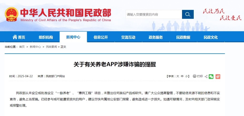 4月22日,民政部發(fā)布公告表示,民政部從未設(shè)立或批準(zhǔn)設(shè)立“一脈養(yǎng)老”“惠民工程”項(xiàng)目,未推出任何類似產(chǎn)品或軟件。請廣大公眾提高警惕,不要輕信來源不明的信息和不實(shí)宣傳,避免上當(dāng)受騙。已經(jīng)參與或可能遭受損失的用戶,建議盡快向?qū)俚毓膊块T報(bào)案,避免造成進(jìn)一步損失。如遇可疑情況,及時(shí)向相關(guān)部門咨詢核實(shí)或報(bào)警處理。(記者朱高祥)