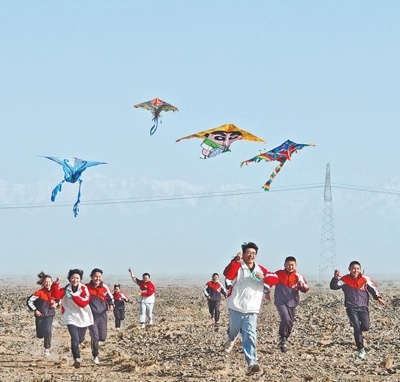 志愿者服務(wù)隊(duì)隊(duì)員帶著學(xué)生們一起放風(fēng)箏。