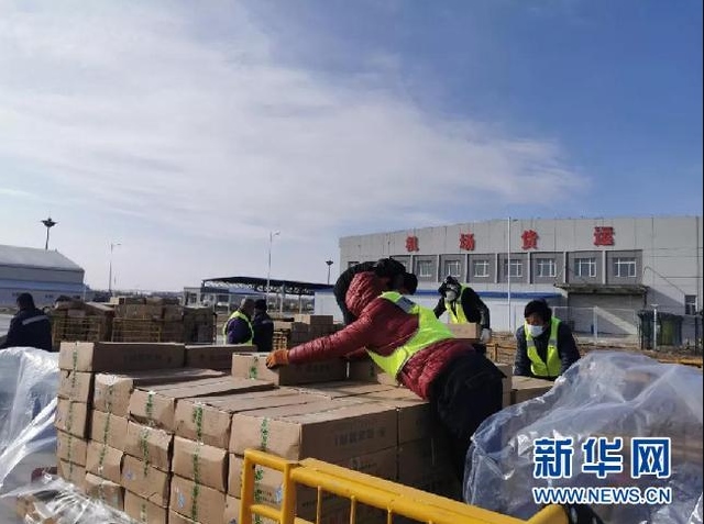 物資在呼和浩特白塔機(jī)場(chǎng)集結(jié)后,20多名物流公司工作人員冒著星夜寒風(fēng),在停機(jī)坪上操作打板,將物資裝機(jī)。