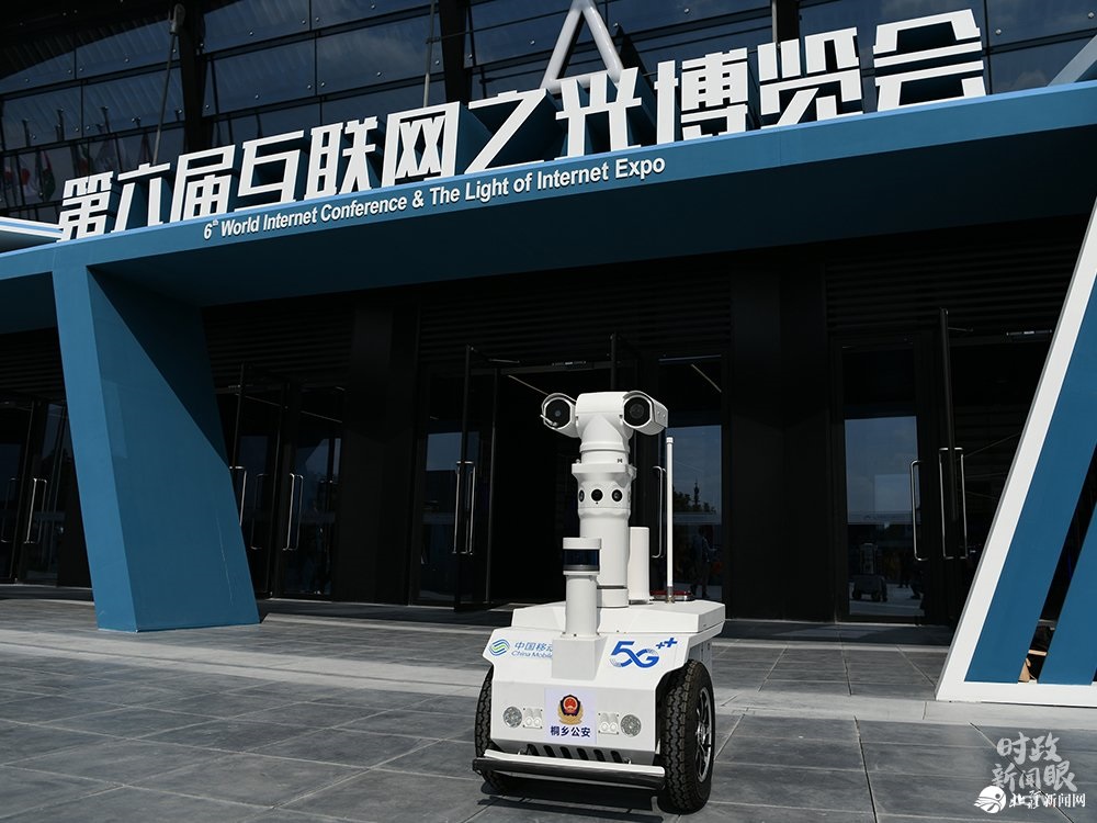 △這是“互聯(lián)網(wǎng)之光”博覽會展館前的5G警用機器人。