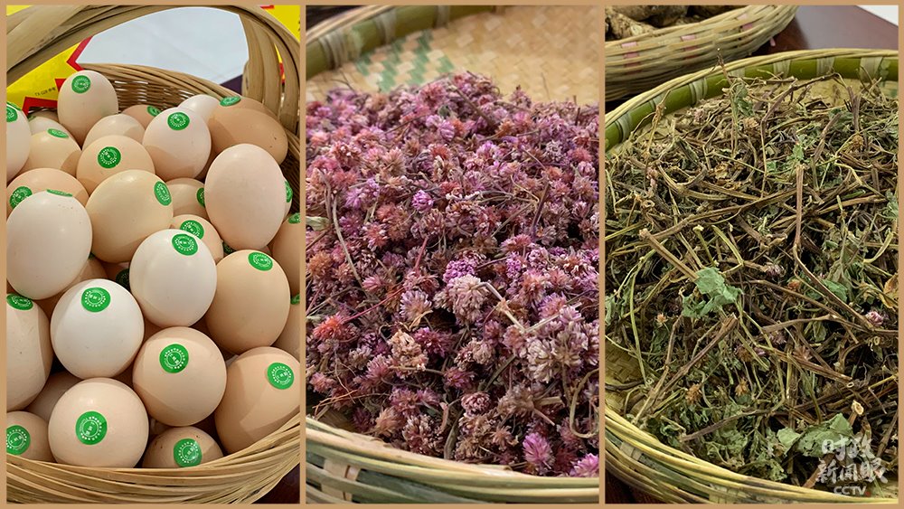 △化屋村走產(chǎn)業(yè)扶貧道路,發(fā)展特色種養(yǎng)殖業(yè)。這是土雞蛋和兩種頭花蓼花。(總臺央視記者郭晗光拍攝)