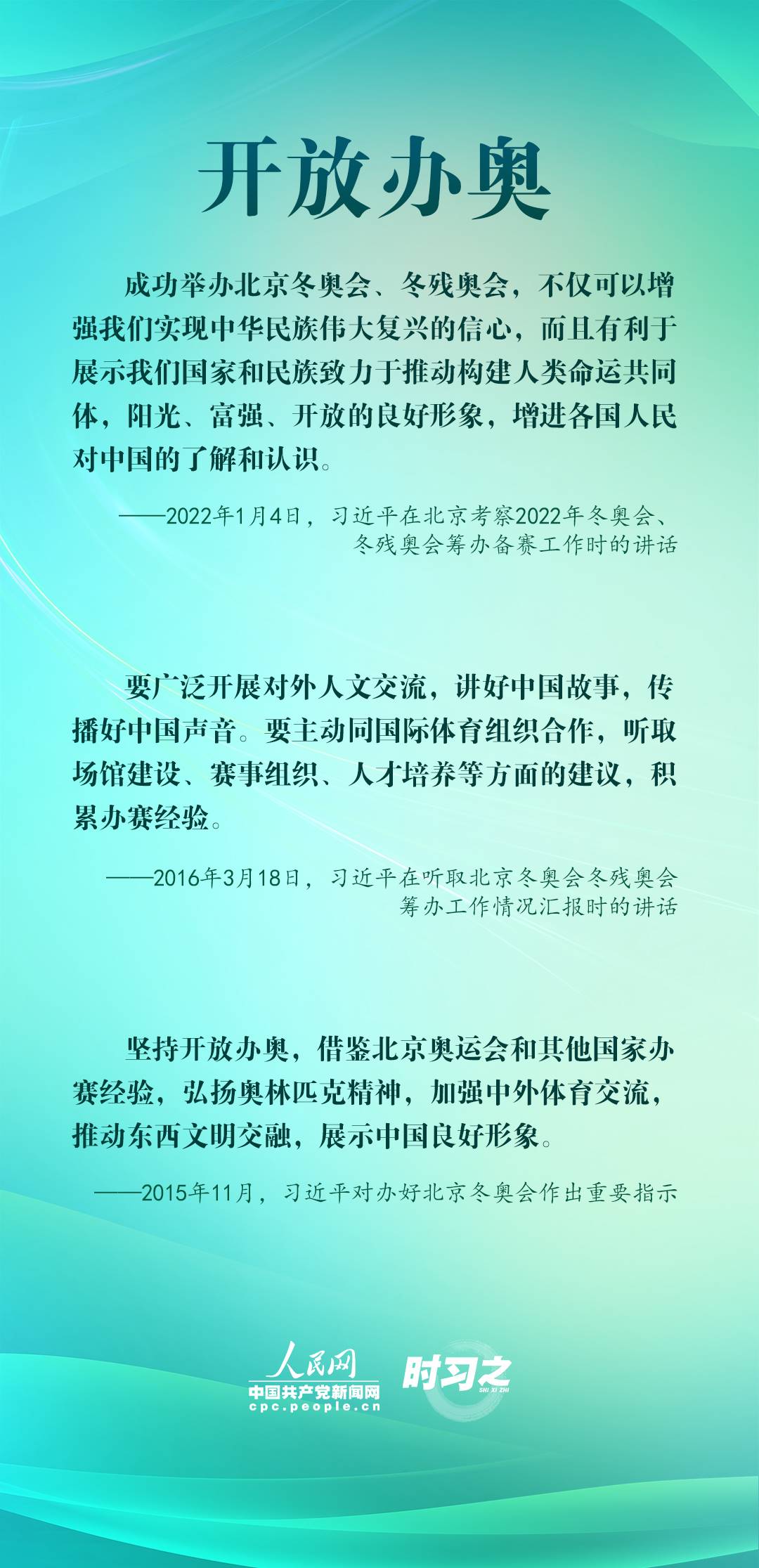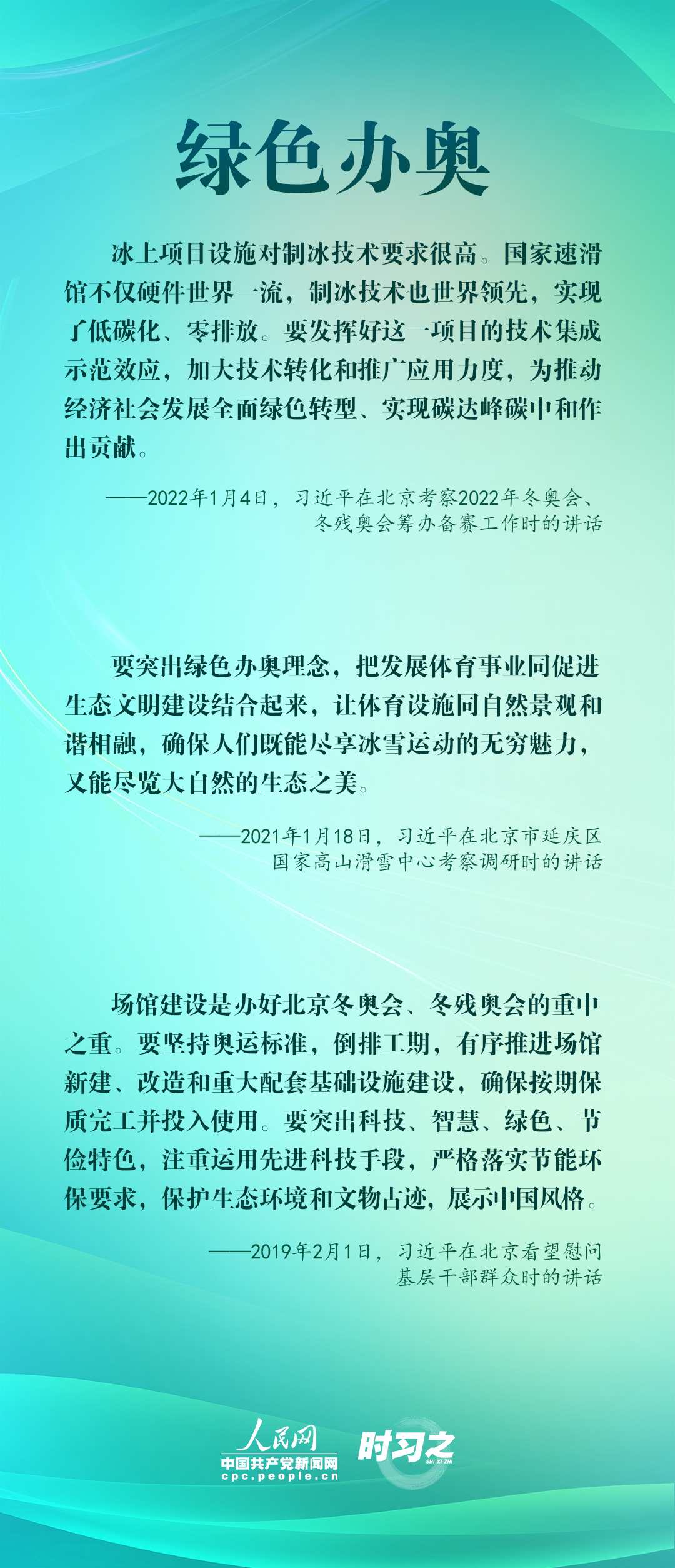 1月4日,習近平在北京考察2022年冬奧會、冬殘奧會籌辦備賽工作,指出“要堅持綠色辦奧、共享辦奧、開放辦奧、廉潔辦奧的理念,突出科技、智慧、綠色、節(jié)儉特色”。辦好北京冬奧會、冬殘奧會,是中國向國際社會作出的莊嚴承諾。習近平多次調(diào)研并強調(diào)綠色、共享、開放、廉潔的辦奧理念。